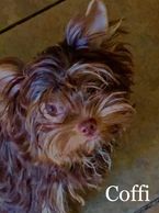 Coffi is the daughter of Chocolate Bark's Black Magic Woman aka "Tonka Bean" a dark traditional Yorkie, and "Dapper" a blue-eyed Merle.
